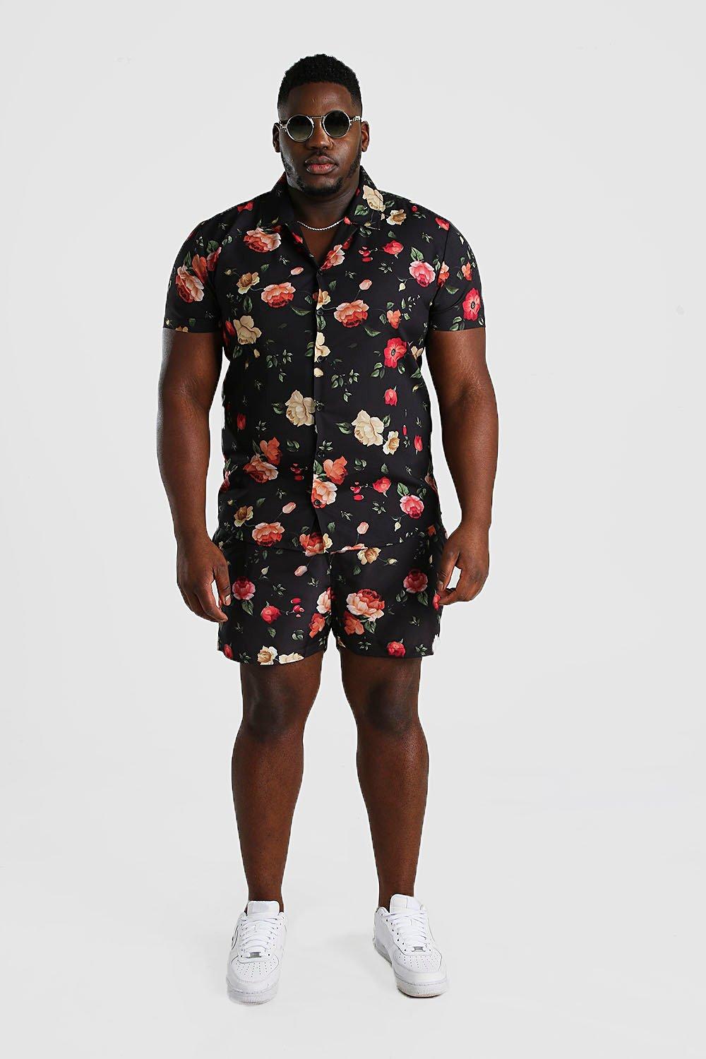 Men S Plus Size Floral Print Shirt And Short Set Boohoo